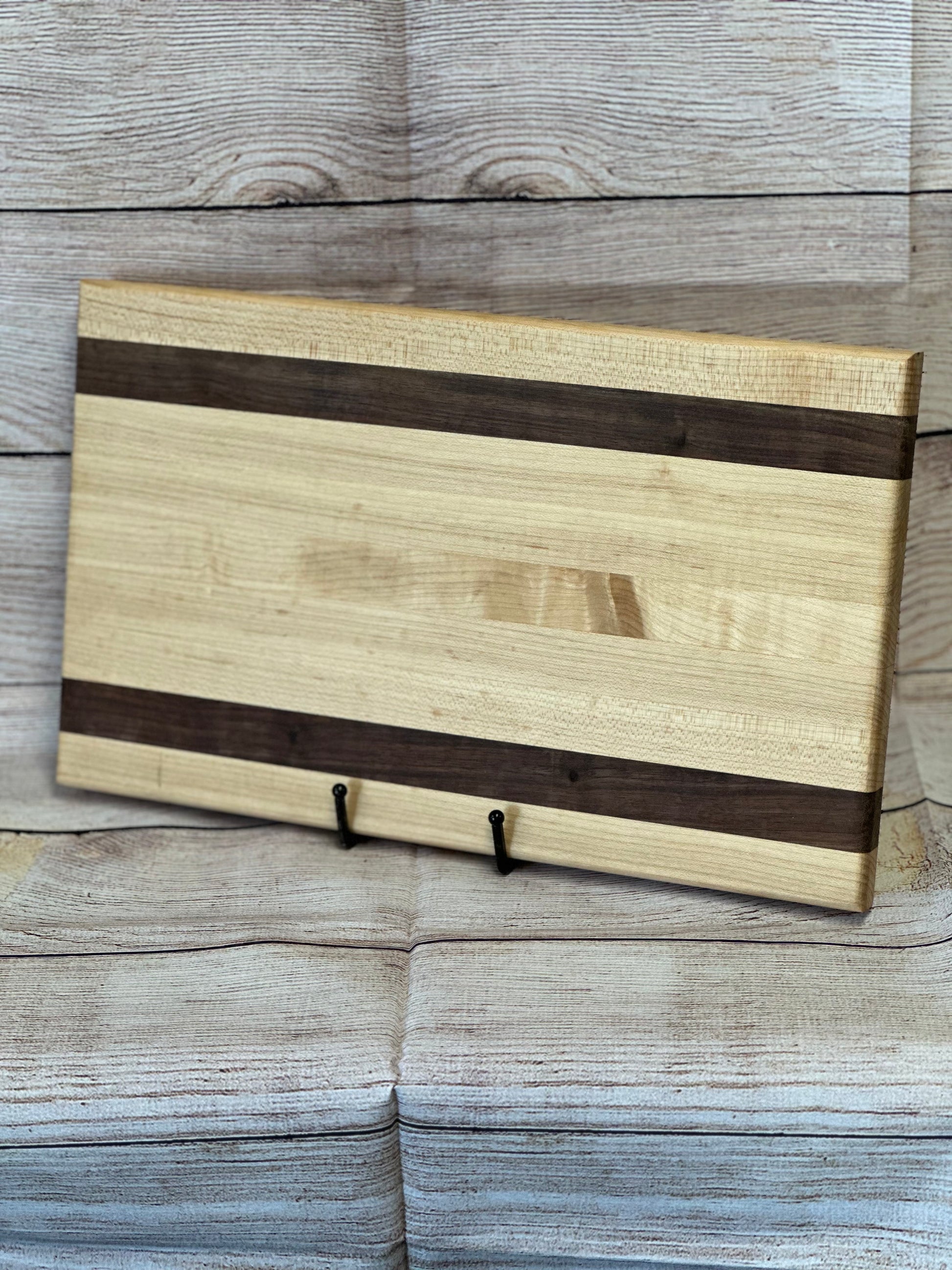 This is our original cutting board produced for the past 10 years. The GEN-1 boards are 15x9x.875. Made from all hardwood and built to last for a lifetime with proper care. All of the walnut boards do not look at the same as the above picture due to wood grain patterns, however they are all built with the same care and passion to be the same. All boards are finished with FDA approved Mineral Oil.