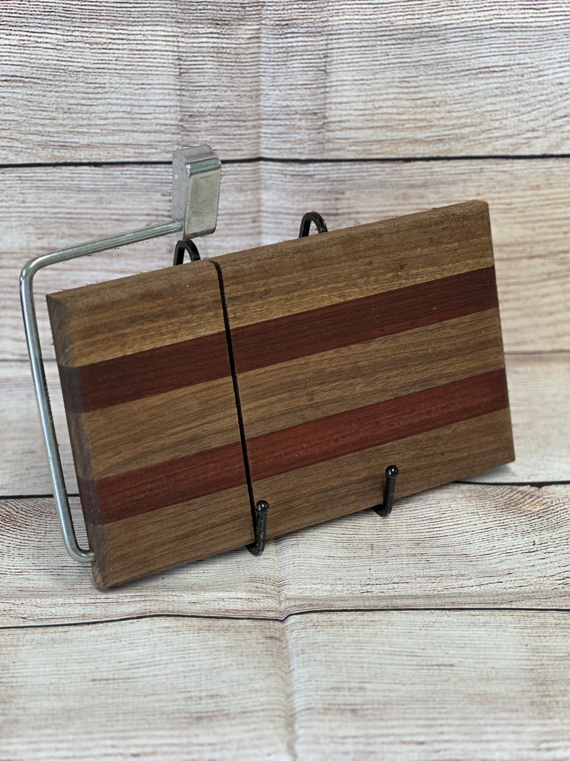 This is our original Cheese Slicers produced for the past 8 years. Cheese slicers are 5.5x9.5x.875. Made from all hardwood and built to last for a lifetime with proper care. All of the walnut boards do not look at the same as the above picture due to wood grain patterns, however they are all built with the same care and passion to be the same. All boards are finished with FDA approved Mineral Oil.
