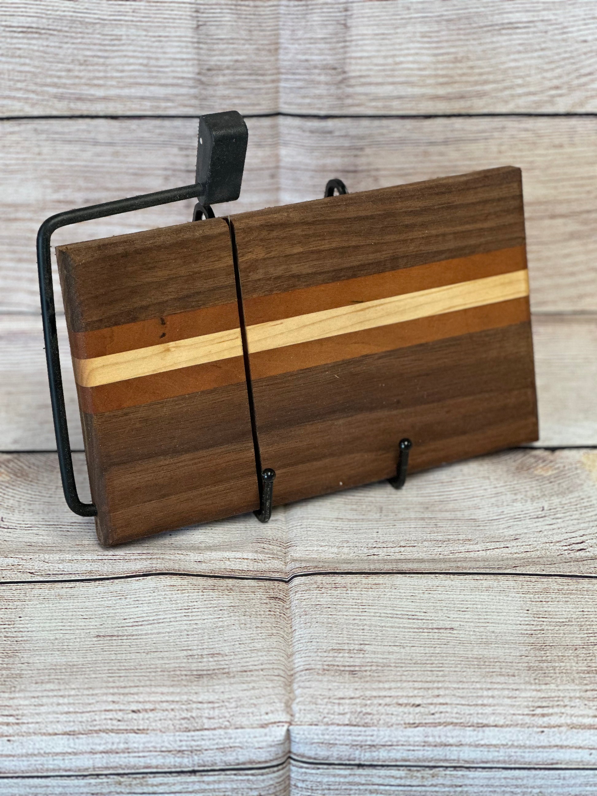 This is our original Cheese Slicers produced for the past 8 years. Cheese slicers are 5.5x9.5x.875. Made from all hardwood and built to last for a lifetime with proper care. All of the walnut boards do not look at the same as the above picture due to wood grain patterns, however they are all built with the same care and passion to be the same. All boards are finished with FDA approved Mineral Oil.